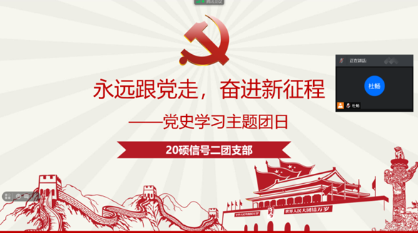 20硕信号二团支部为了紧跟时代步伐,用党的奋斗历程和伟大成就鼓舞斗志、明确方向。20硕信号二团支部组织了线上支部会议,共同学习党史。