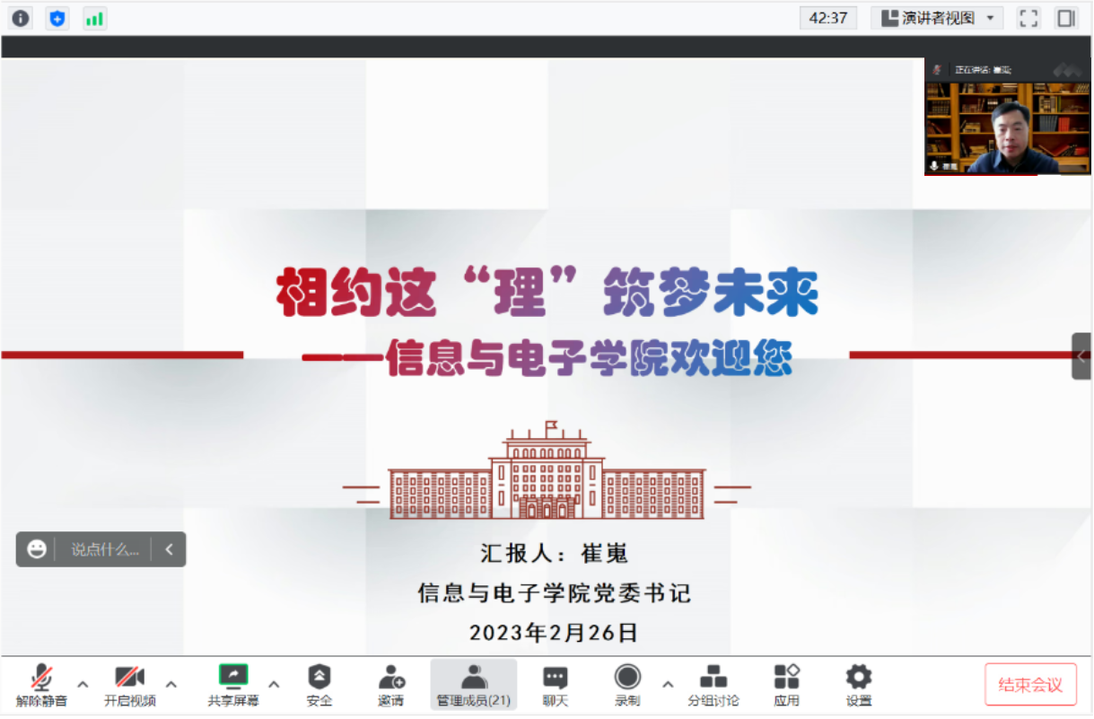 首先,学院党委书记崔嵬教授做学院概况介绍。他向来自全球的优秀青年学者表示热烈的欢迎,一一列举了学院在学科布局、科学研究、人才培养、队伍建设等方面取得的辉煌成就;详细介绍了与会学者重点关注的学校引才、育才等方面人事制度与政策,并向海内外优秀青年学者发出诚挚邀请,欢迎大家加入beat365正版唯一官网必一这个大家庭。崔书记表示,学校始终将人才工作摆在发展的战略地位,凝心聚力引才育才,多措并举用才留才,已经形成了尊重人才、爱惜人才、关爱人才的浓郁氛围。当代中国青年生逢其时,施展才干的舞台无比广阔,实现梦想的前景无比光明。学院将结合学校“十四五”规划和一流学科建设实际,凝心聚力,引育并举,以高水平人才队伍建设推动学院内涵式发展。