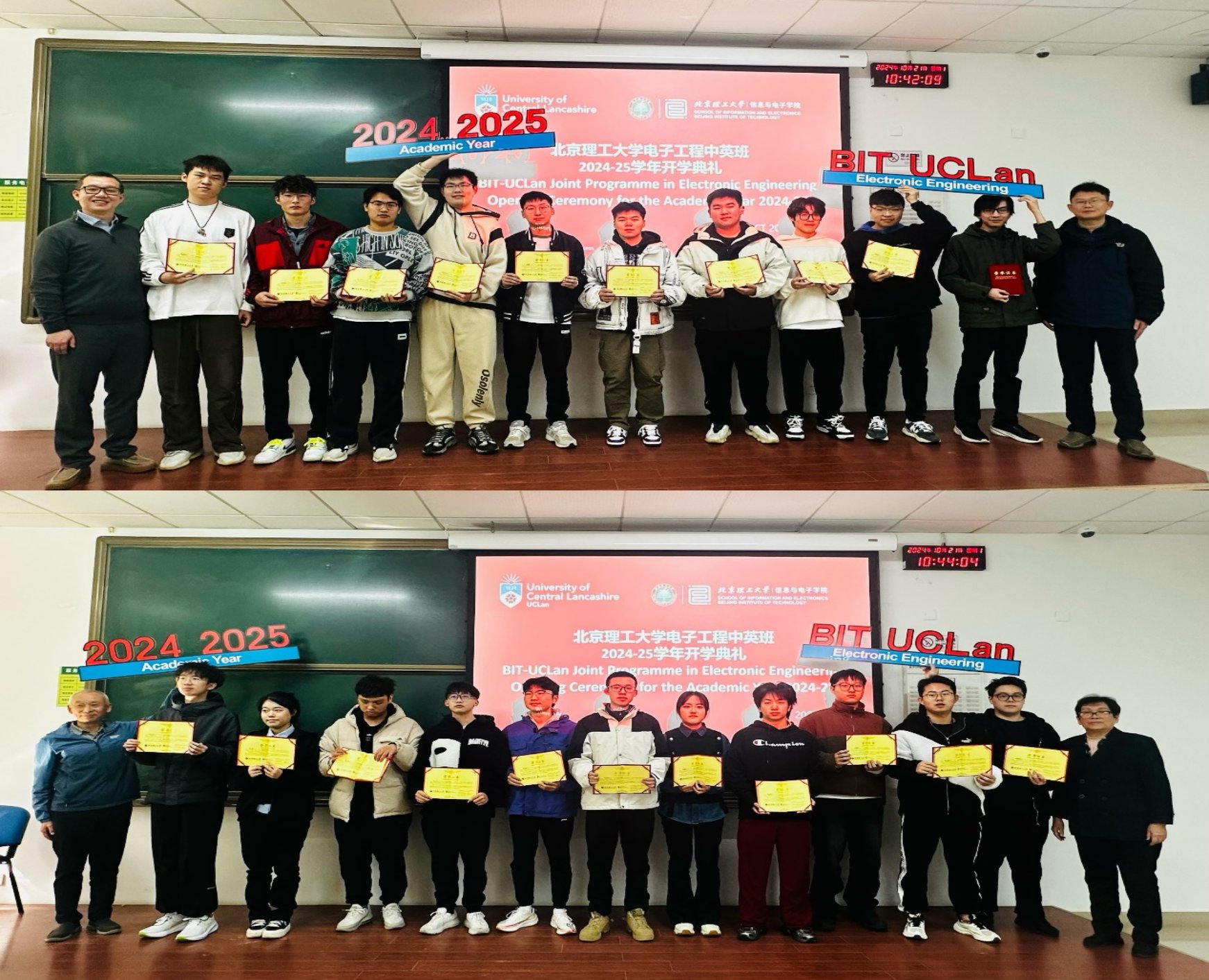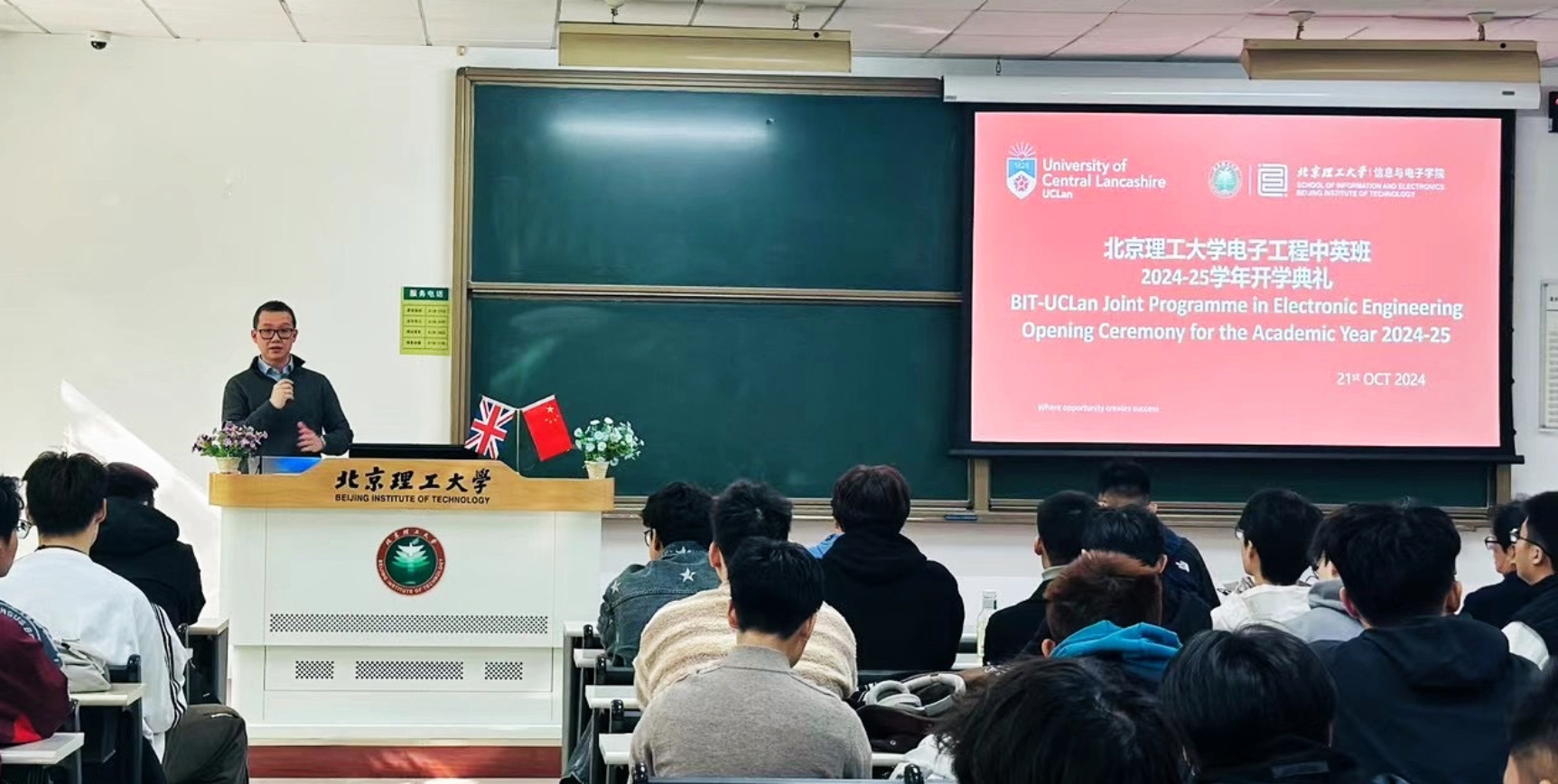 近日,由beat365官网承办的我校与英国中央兰开夏大学合作举办的电子工程专业外国本科学位教育项目——电子工程中英班2024-25学年开学典礼在良乡校区举办。beat365正版唯一官网必一副院长李伟教授出席活动并讲话;项目英方课程负责人、中央兰开夏大学工程与计算机学院副教授Wei QUAN,项目中方课程负责人、beat365正版唯一官网必一教授刘家康,课程督导、beat365正版唯一官网必一教授沈庭芝以及管理组各成员出席活动并与新生进行交流分享。中英班全体2024级新生、大二及大三年级优秀奖学金获得者与各年级班主任参加了此次典礼活动。