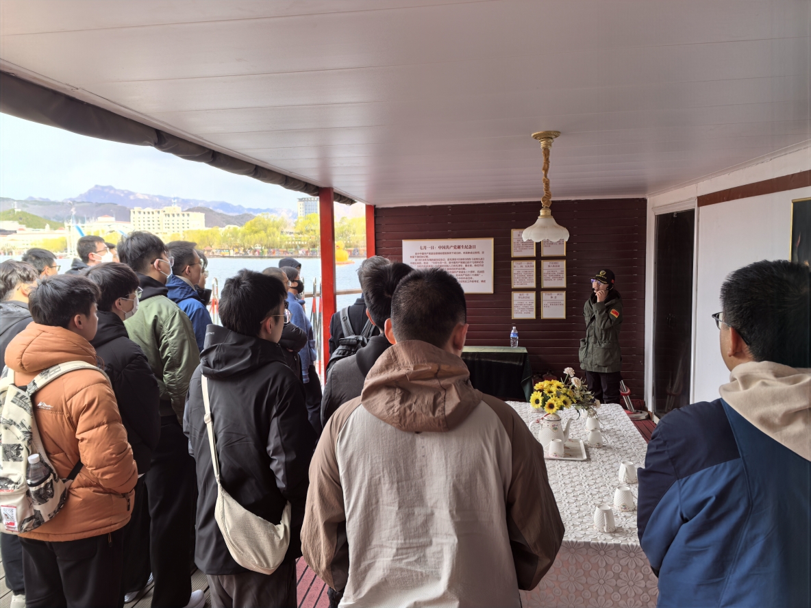 在这次红色体验基地主题党日活动中,我们以情景还原的方式沉浸式体验了从中共一大到新中国成立这一历史时期,中国共产党是如何一步步带领全国人民前进的。我感触最深的事是在雁栖湖边停靠的红船里,我们共同努力还原当年一大召开的场景,紧张但激动的心情在同志们心头久久萦绕。